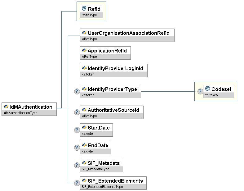 | IdMAuthentication | This object establishes an authentication map between the Organization-User and the Identity Provider (IDP) LoginId. The profile will be used primarily to provision/deprovision users from the SIS/HR systems to the IDP. | ||||