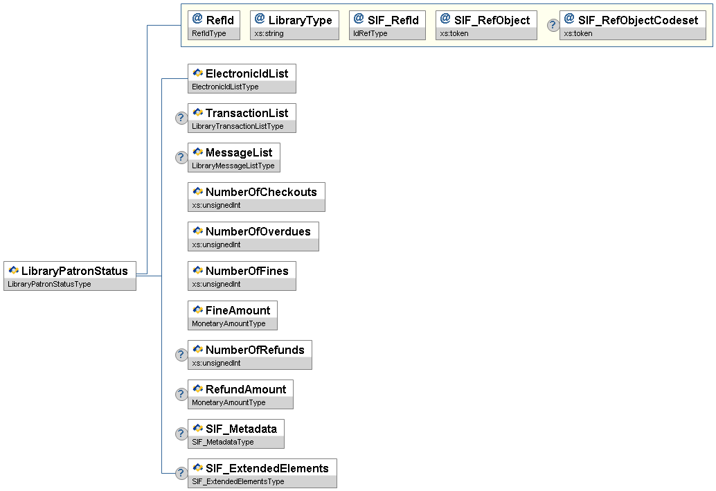 Figure 3.12.1-1: LibraryPatronStatus| Element/@Attribute | Char | CEDS Id/URL | Description | Type | |