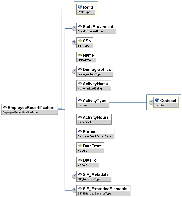 Figure 3.14.4-1: EmployeeRecertification| Element/@Attribute | Char | CEDS Id/URL | Description | Type | |