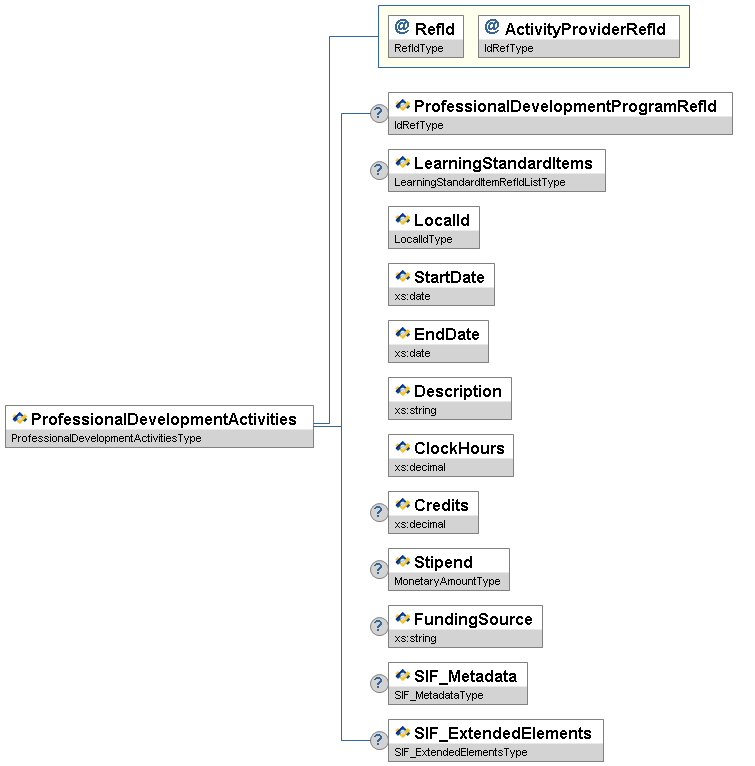 | @ | ProfessionalDevelopmentActivitiesRefId | M | References the ProfessionalDevelopmentActivities object | IdRefType | |