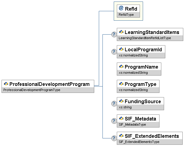 | ProfessionalDevelopmentProgramRefId | O | Relationship Id for professional development program. | IdRefType | ||