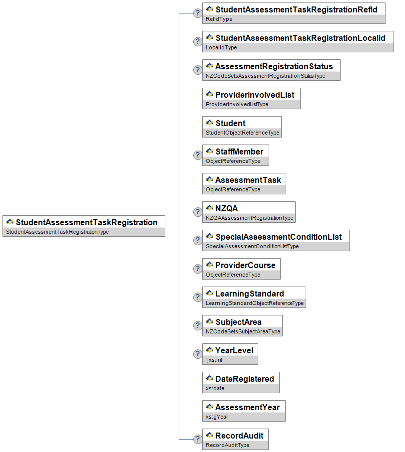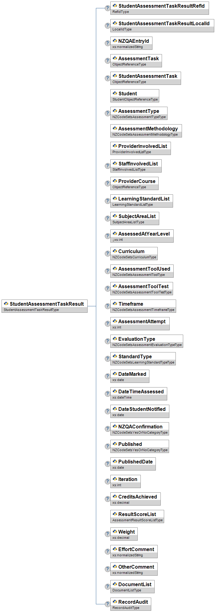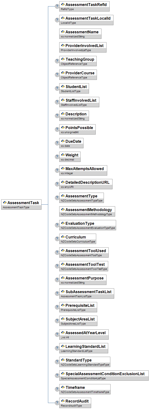 | AssessmentType | O | Low | Type of assessment (e.g. diagnostic vs paedagogical - Summative or Formative). | NZCodeSetsAssessmentTypeType | |||||
