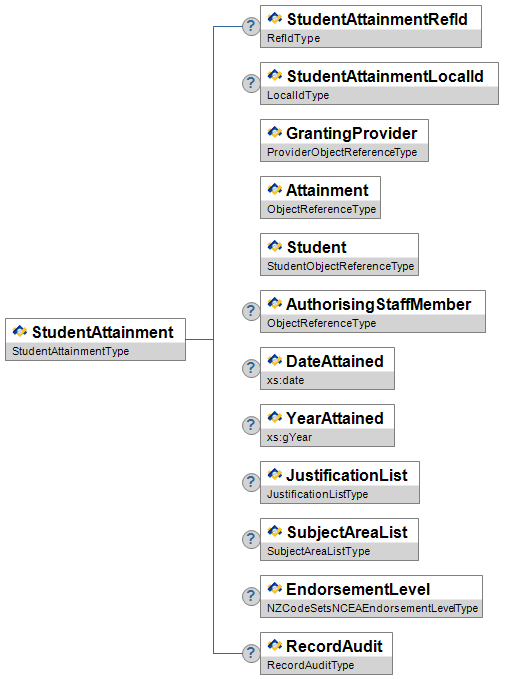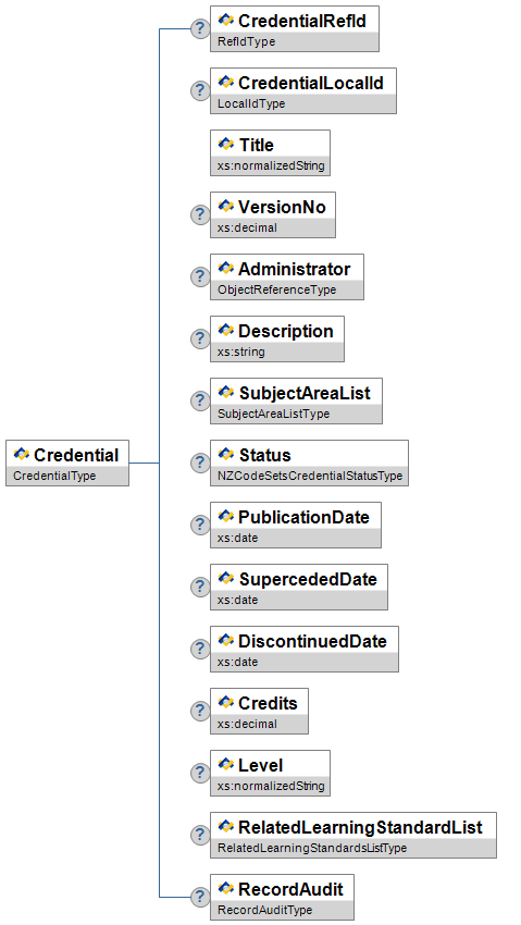 | Level | O | Low | The level of the credential if applicable, eg. 1,2 or 3 for NCEA levels | xs:normalizedString | |