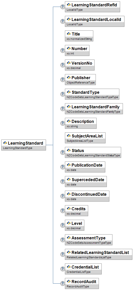 | StandardType | O | Low | The type of standard the result is for. Applies to secondary level assessments, e.g. unit and achievement standards, scholarships and International Baccalaureate. | NZCodeSetsLearningStandardTypeType | |||||
