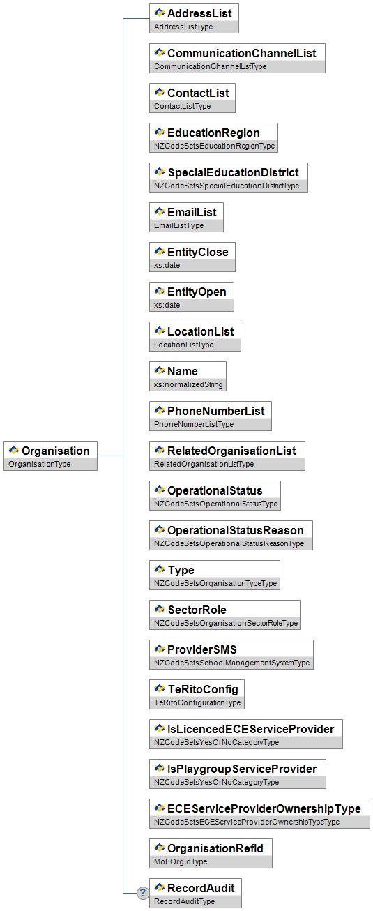 | RecordAudit | O | Low | The audit details for a record, e.g. Created/Last Updated DateTime and Created/Last Updated By. | RecordAuditType |