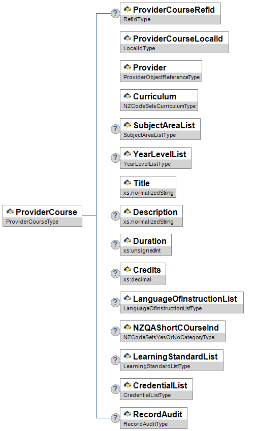 | ProviderCourse | O | Low | Generic object reference to the ProviderCourse all of whose students will be participating in the assessment task. | ObjectReferenceType | |||||