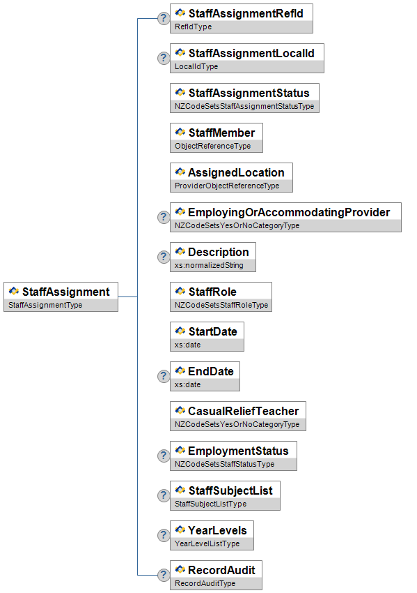 | StaffInvolvedList | O | Low | A list of the staff involved and their role in relation to the assessment task, e.g. the moderator, the marker. | StaffInvolvedListType | |||||