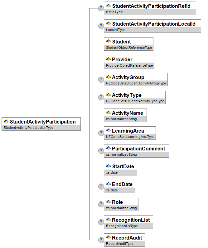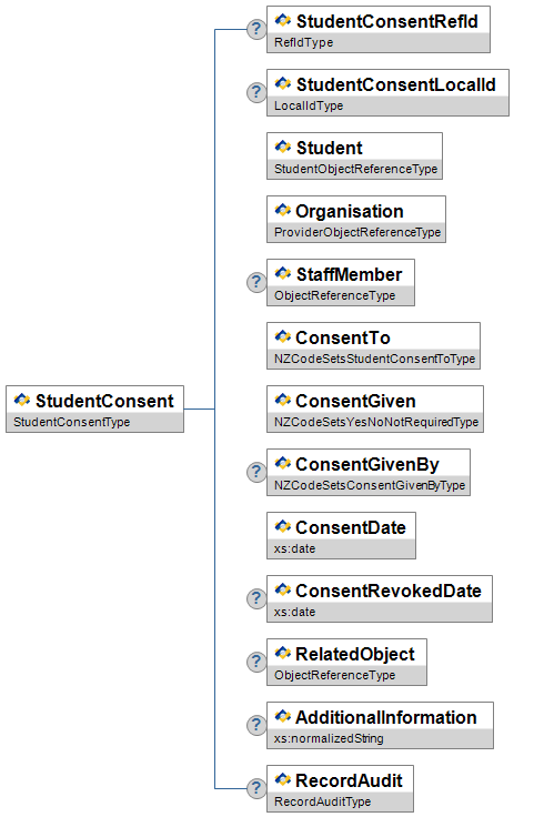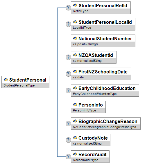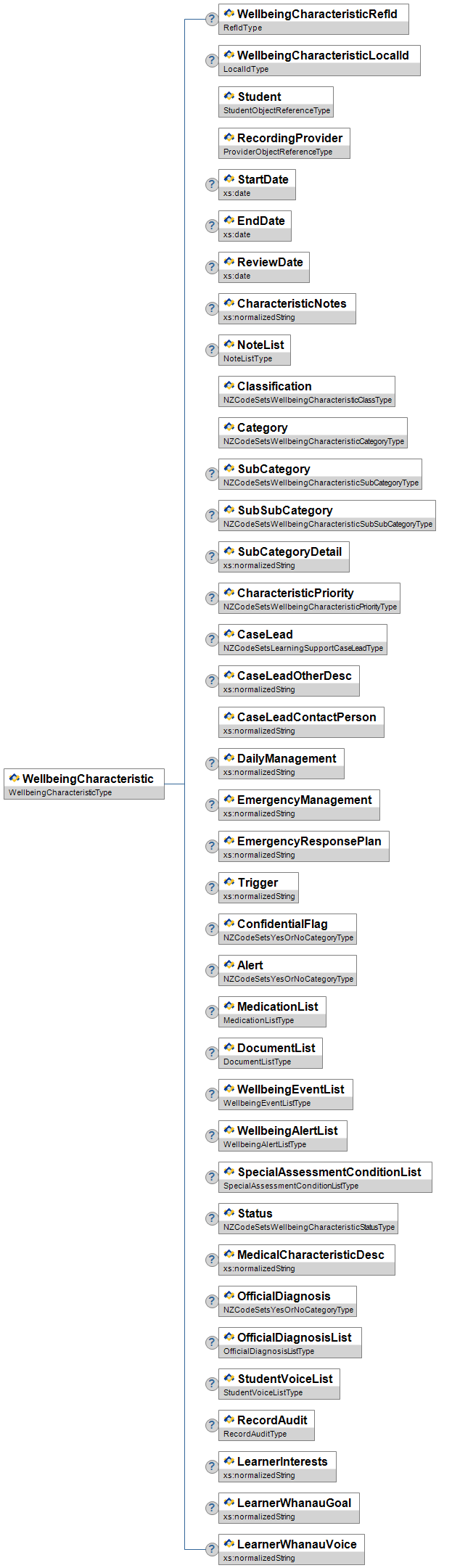 | OfficialDiagnosis | O | Low | Indicates whether or not the student has an official diagnosis that pertains to this Wellbeing Characteristic. | NZCodeSetsYesOrNoCategoryType | |