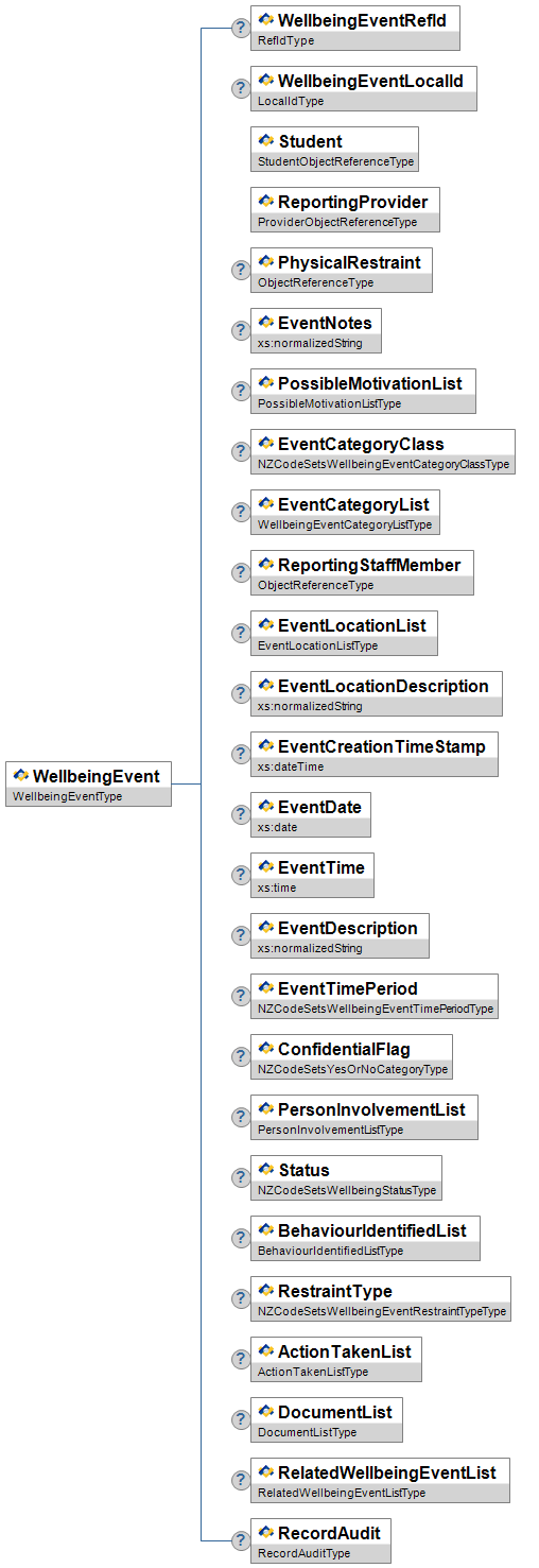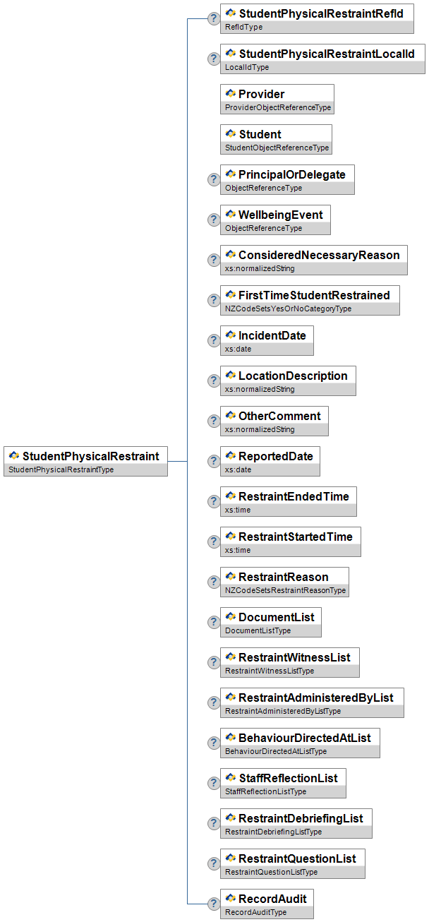 | RestraintType | O | High | The StudentPhysicalRestraint if it was administered to the student as part of this WellbeingEvent. | NZCodeSetsWellbeingEventRestraintTypeType | |
