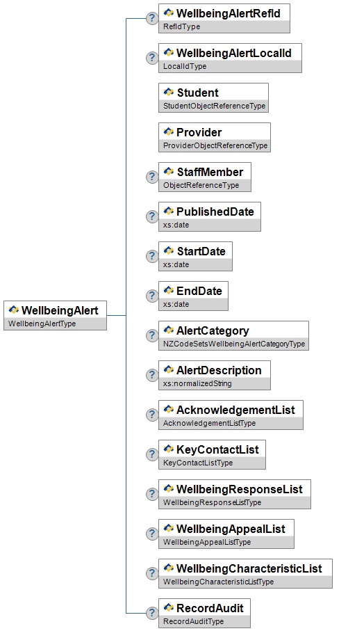 | WellbeingAlert | O | High | Generic object reference to the WellbeingAlert this WellbeingAppeal's outcome has triggered. | ObjectReferenceType | |
