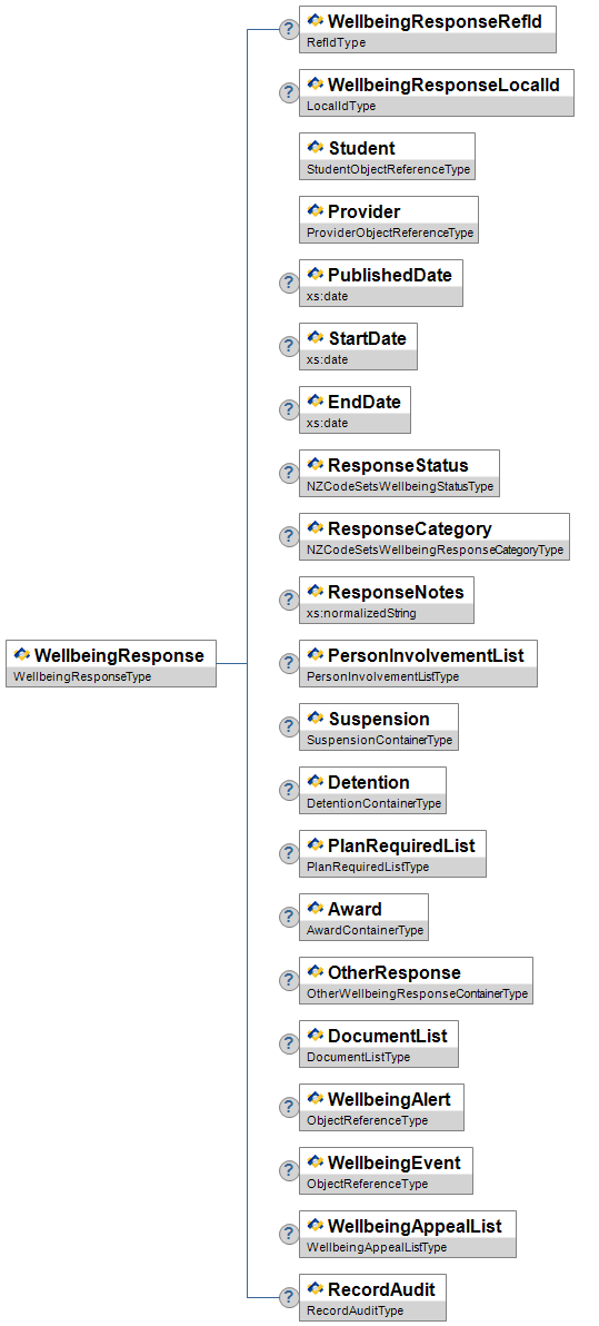 | PersonInvolvementList | O | High | List of People involved in the Wellbeing Event/Response. Mandatory if more people than the student to which this event/response occurs is involved. | PersonInvolvementListType | |