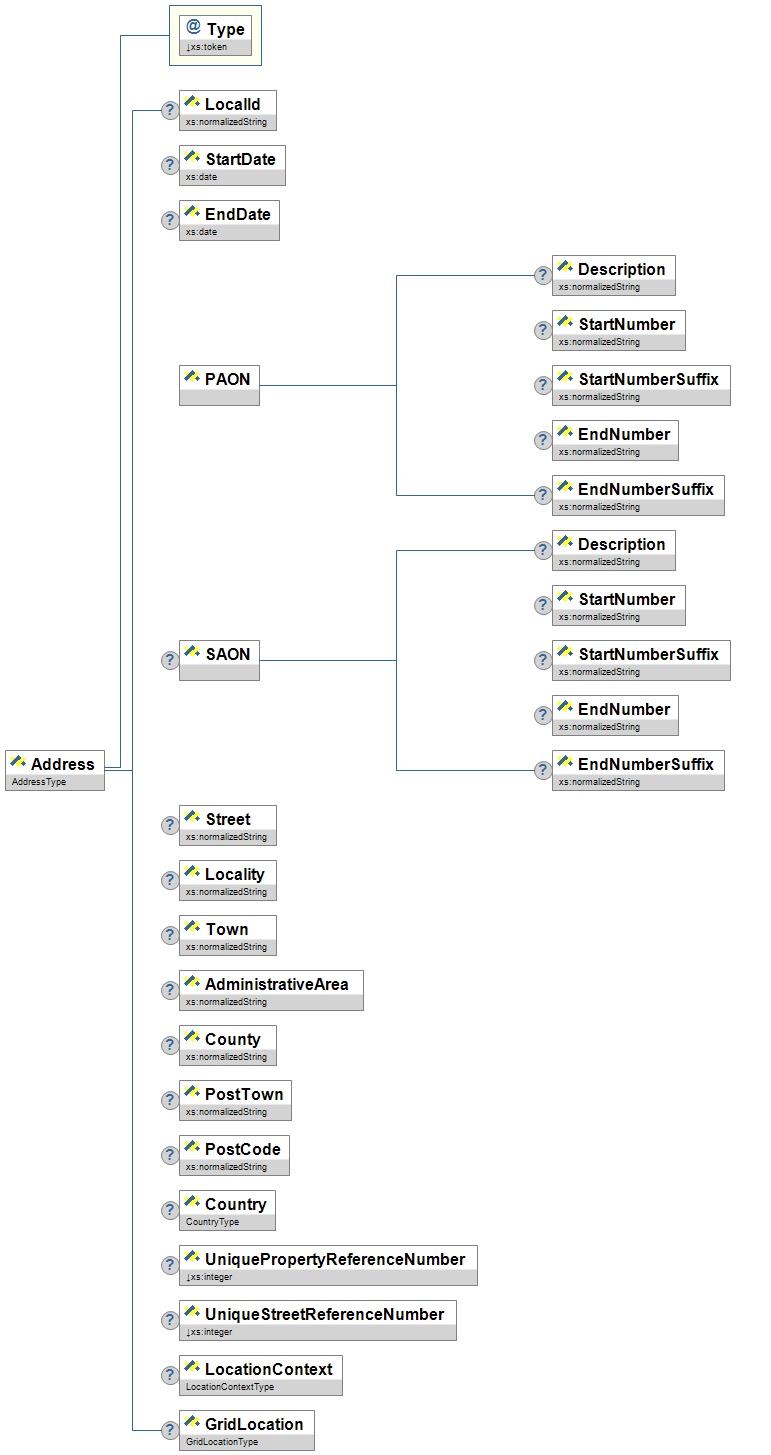 | PAON/Description | C | Dwelling name, or at least a general description of the location in lieu of having any other information. This is required when no other PAON information is provided. | xs:normalizedString | |||||