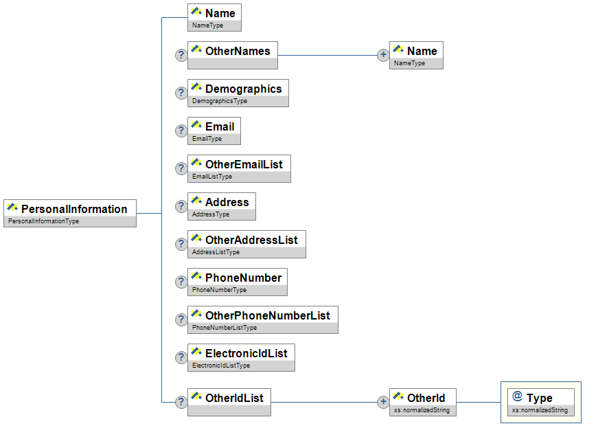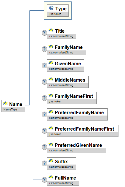 | Name | The Name element defines name information for a person and occurs within the PersonalInformation element. | |||