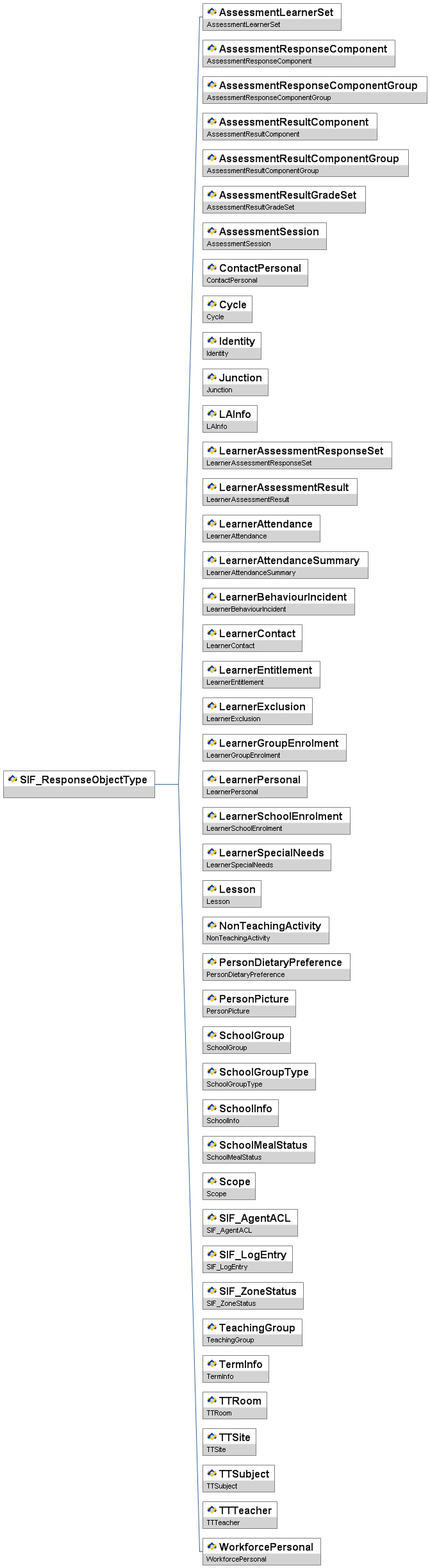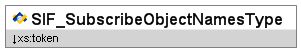 SIF_Provide message.Figure A.15-1: SIF_ProvideObjectNamesTypeTable A.15-1: SIF_ProvideObjectNamesTypeSIF_Request message, or every SIF object name.Figure A.16-1: SIF_RequestObjectNamesTypeTable A.16-1: SIF_RequestObjectNamesTypeSIF_Response message.Figure A.17-1: SIF_ResponseObjectsTypeTable A.17-1: SIF_ResponseObjectsTypeSIF_Response message, or every SIF object.Figure A.18-1: SIF_ResponseObjectTypeTable A.18-1: SIF_ResponseObjectTypeSIF_Subscribe message.Figure A.19-1: SIF_SubscribeObjectNamesTypeTable A.19-1: SIF_SubscribeObjectNamesType| Element/@Attribute | Char | Description | Type | |