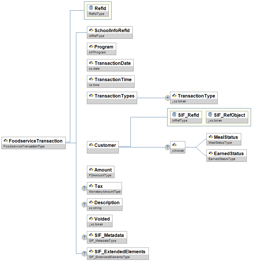 | FoodserviceTransaction | This object communicates food service transaction information. This is the key object that will be present for every food service transaction. Note: With SIF Implementation Specification version 2.4 the choice element depicted in the diagram below has changed. In the XSD files, the choice element used to be rendered as a sequence of optional elements. Now, in the XSD files, the choice element is rendered as an xs:choice. This may cause problems with agents that treat the choice element as two optional elements rather than a choice of one and only one of the choices. | |||