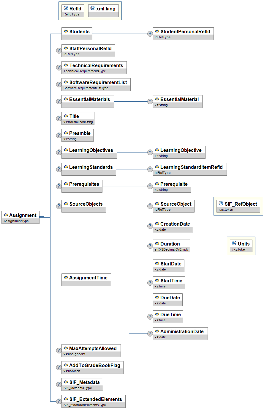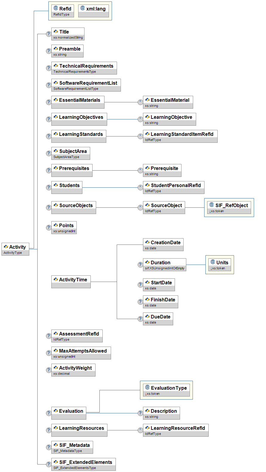 | AssessmentRefId | O | Link to the SIF Assessment object containing the evaluation information for this activity. | IdRefType | |