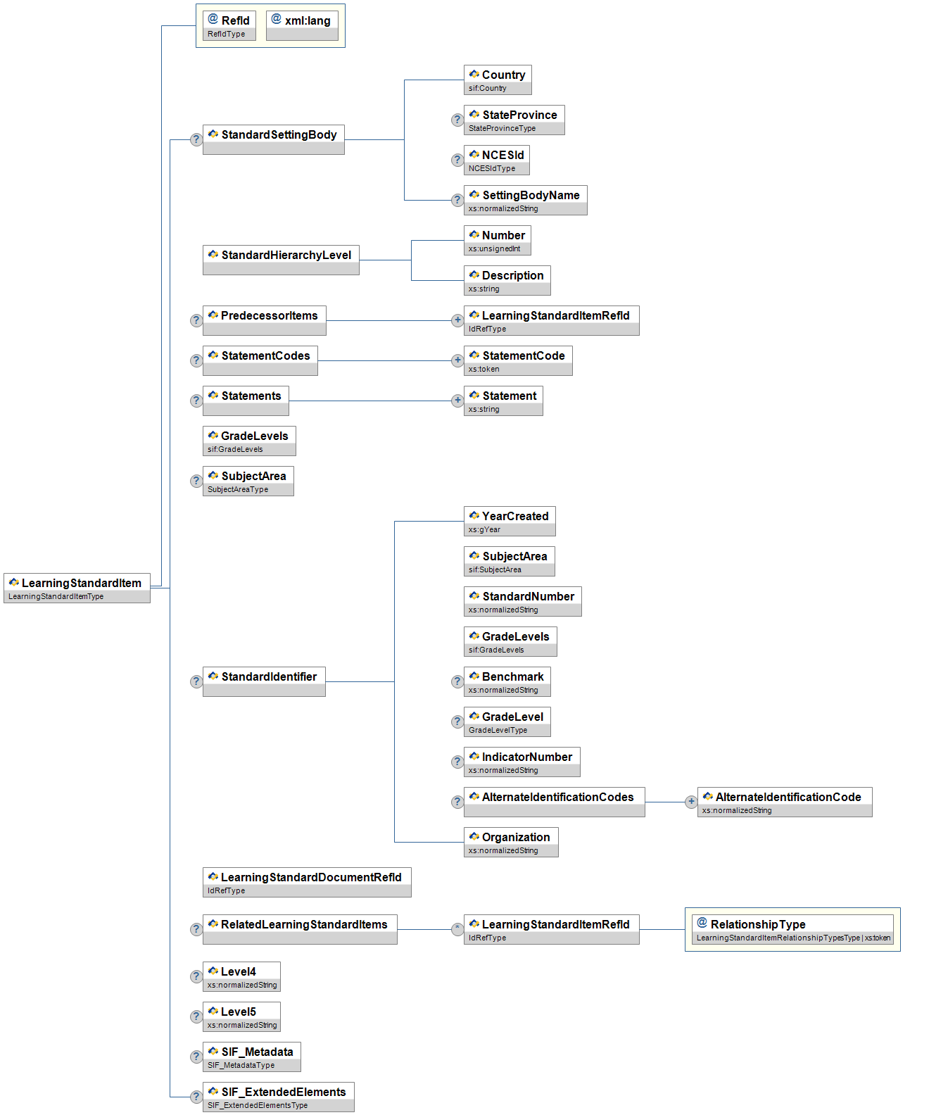 | RelatedLearningStandardItems/ LearningStandardItemRefId | OR | A relationship between the current standard item and another standard item. | IdRefType | |