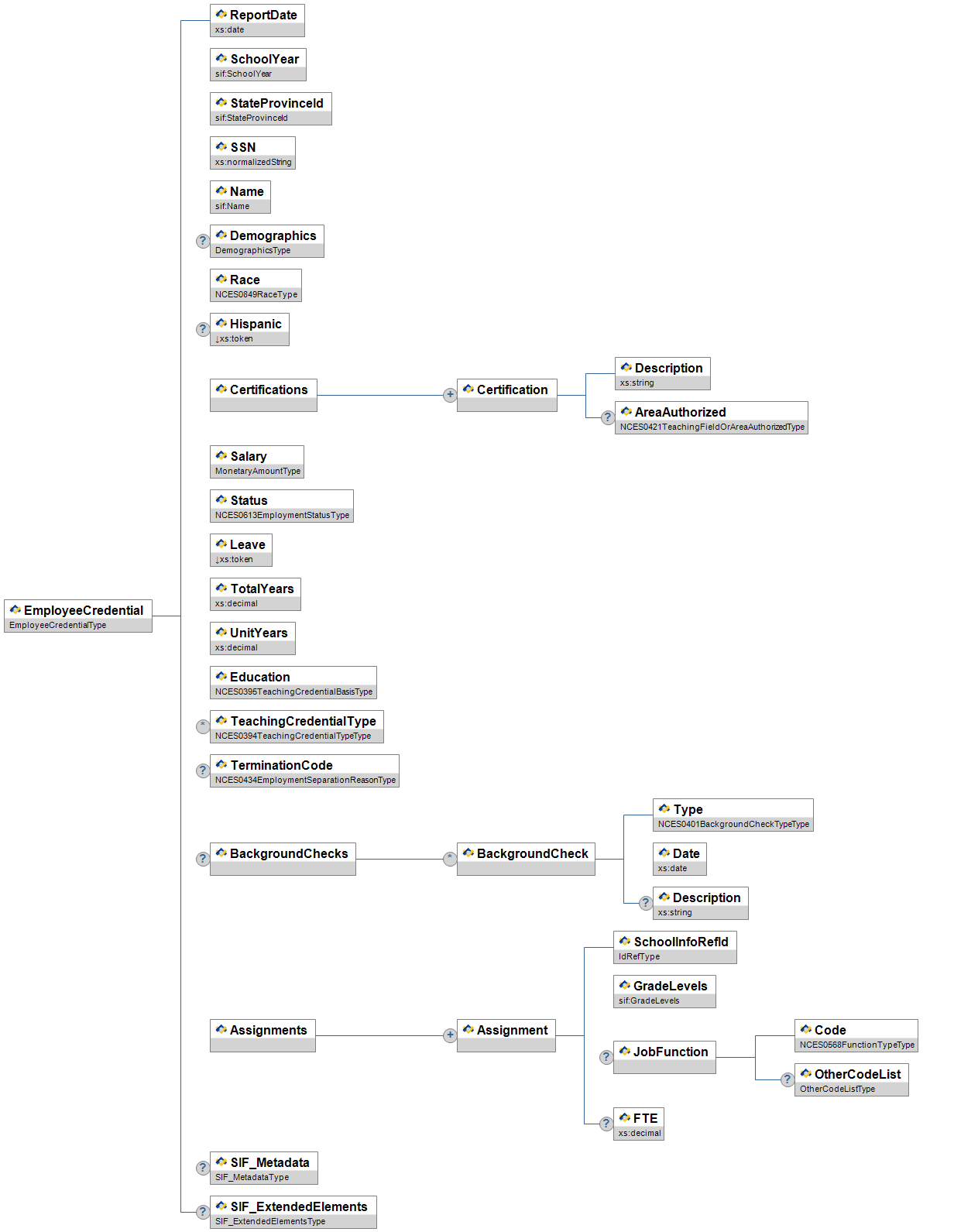 | Certifications/Certification/ AreaAuthorized | O | Area in which employee has certification | NCES0421TeachingFieldOrAreaAuthorizedType | |