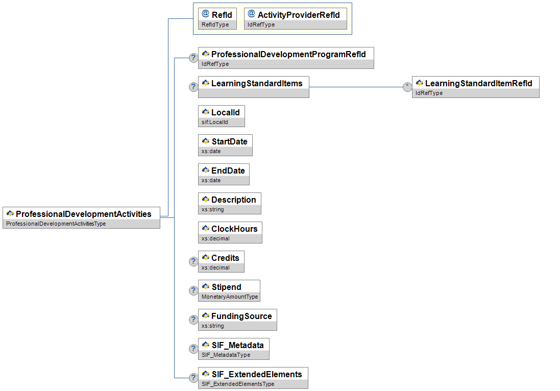 | @ | ProfessionalDevelopmentActivitiesRefId | M | References the ProfessionalDevelopmentActivities object | IdRefType |