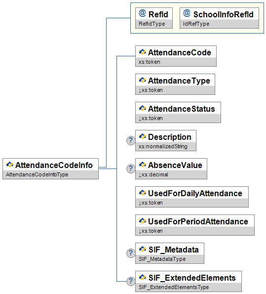 Figure 3.14.1-1: AttendanceCodeInfo| Element/@Attribute | Char | Description | Type | |||||