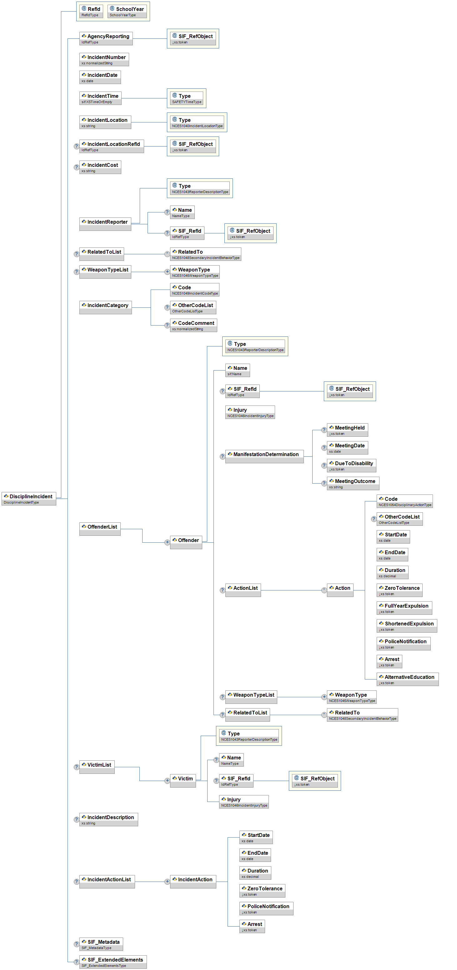 | DisciplineIncident | This object provides information on incidents involving violence, weapons, drugs, and other safety and discipline issues. | |||