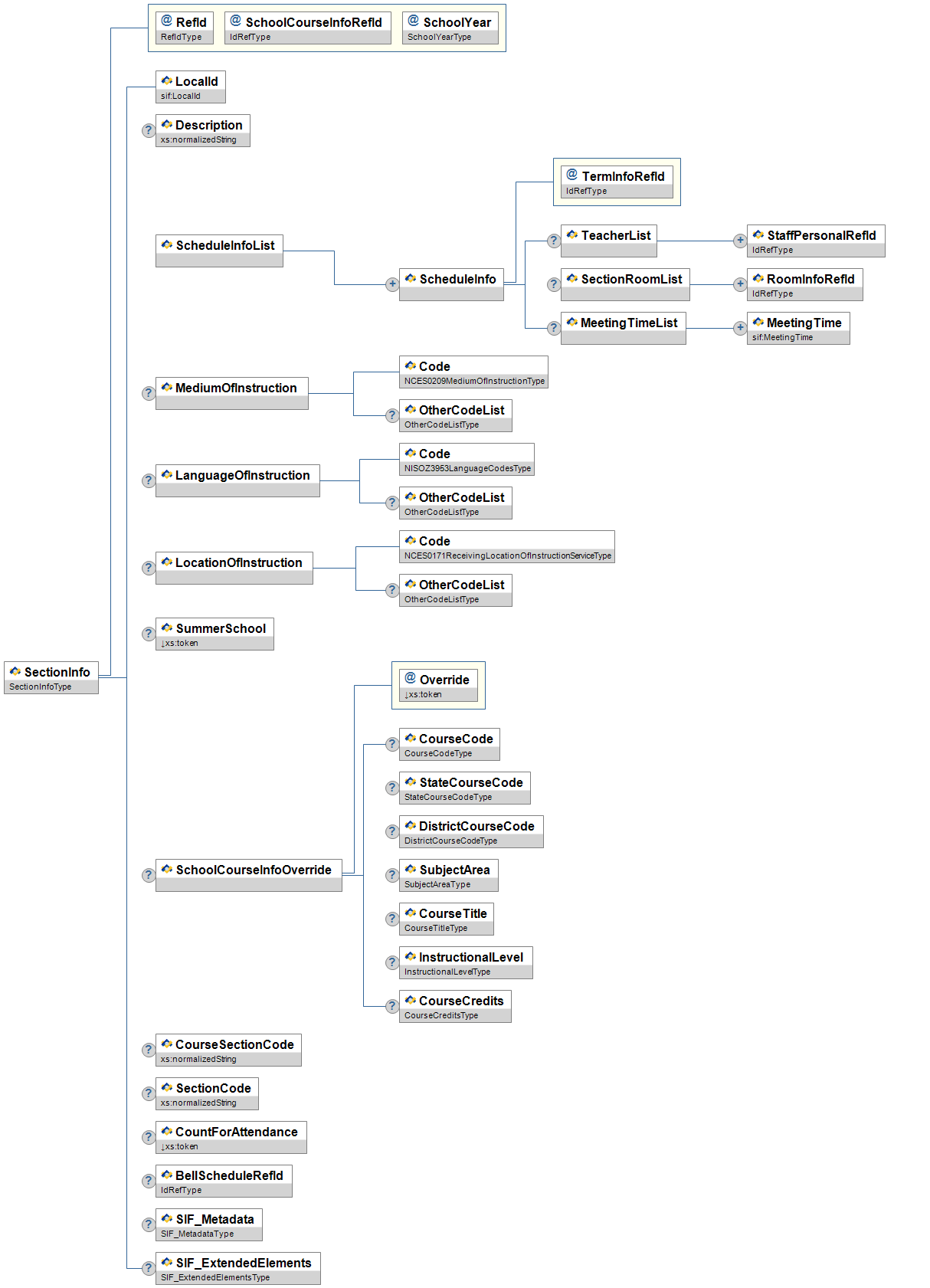| @ | SectionInfoRefId | M | The Id (GUID) of the section in which this student is enrolled. | IdRefType |