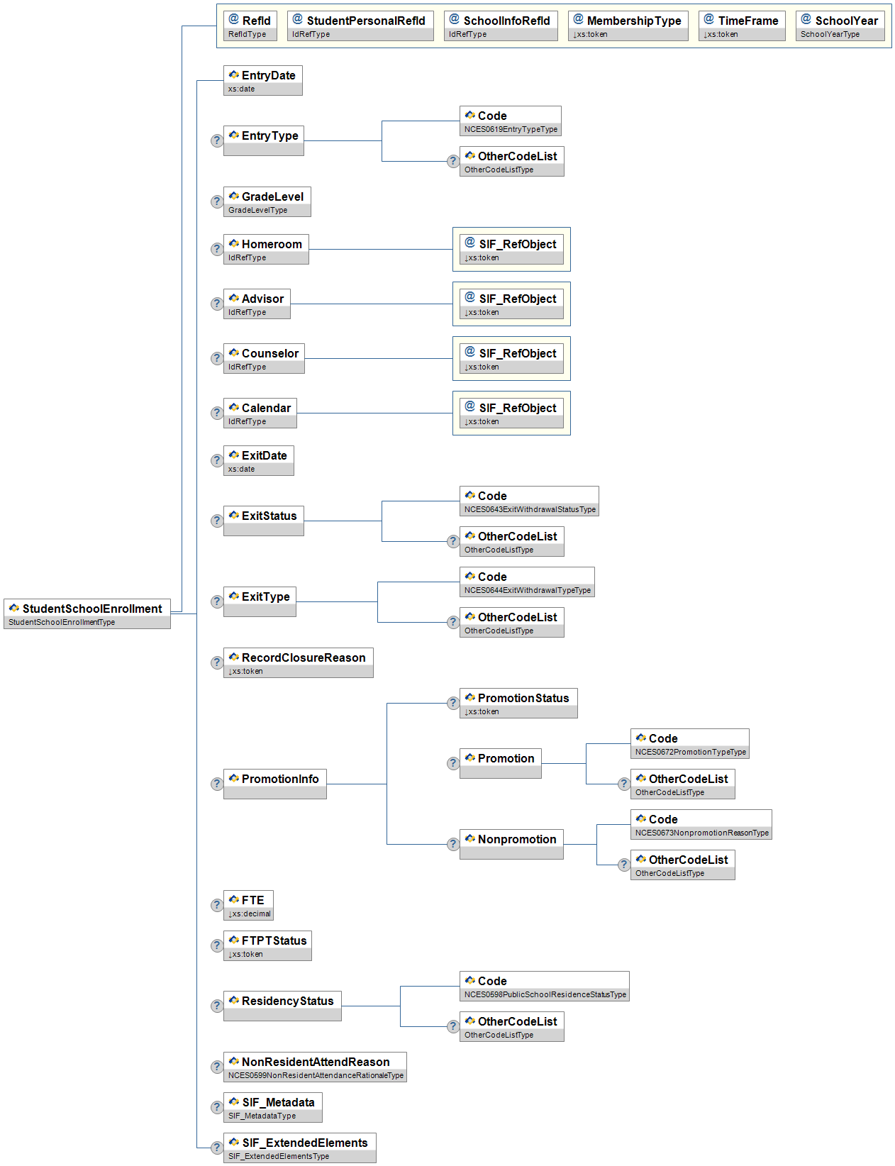 | HomeEnrollment/StudentSchoolEnrollmentRefId | O | The Id (GUID) of the StudentSchoolEnrollment object from which the enrollment information is derived. | IdRefType | |