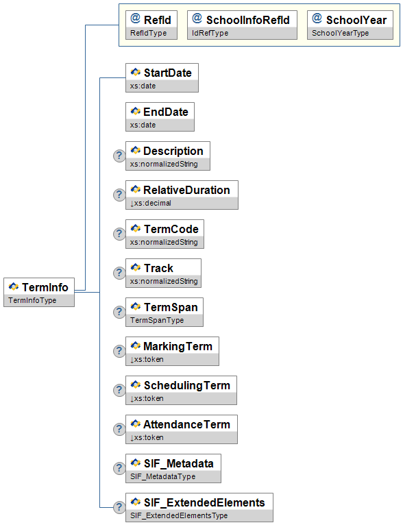 | TermInfo | This object provides information about a term; i.e., a reportable period of time. | |||||||||