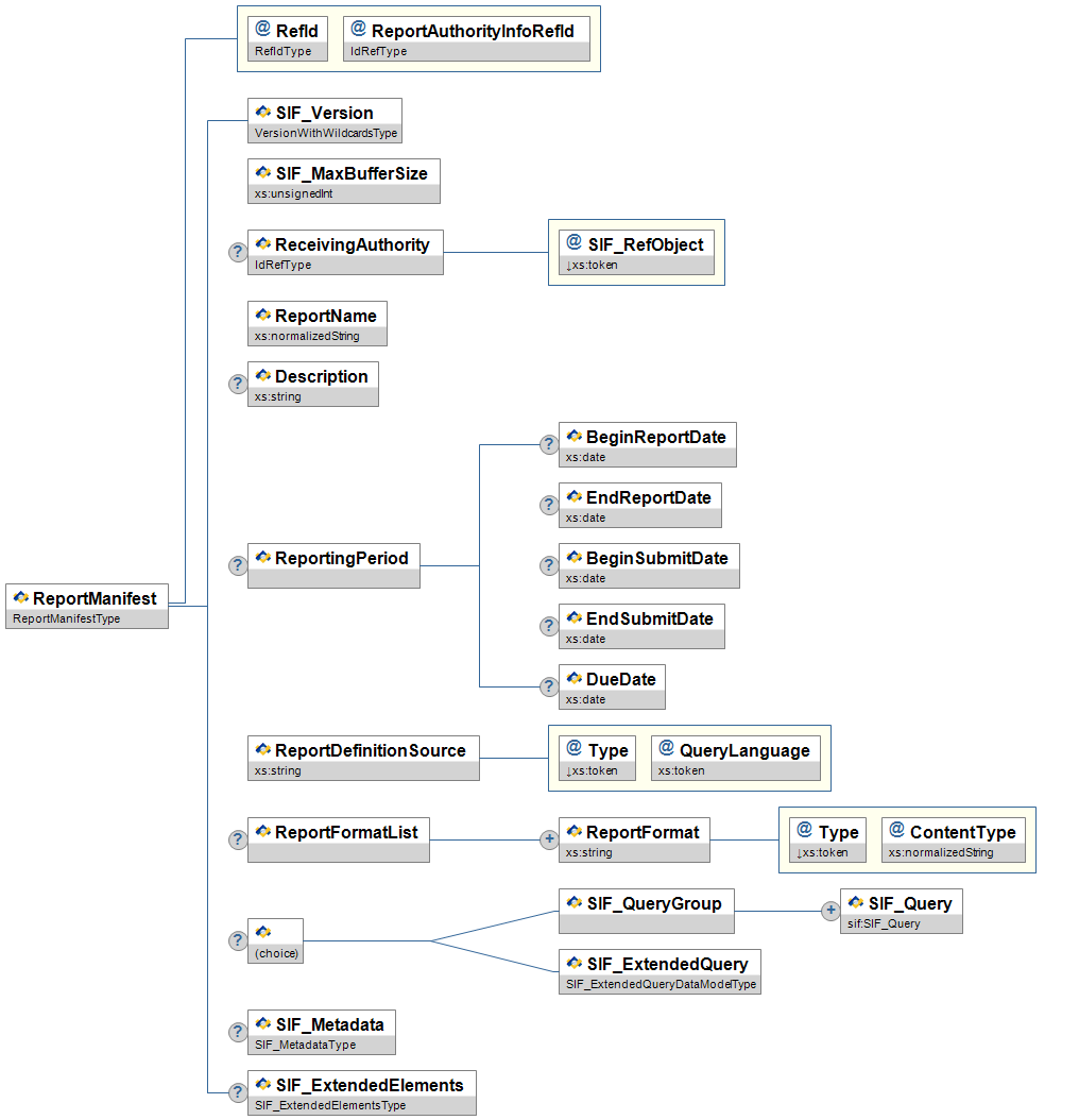 | ReportManifest | This object provides a way to define a report within a SIF zone. It contains metadata about the report. This object represents a mutual agreement between senders and receivers of the report. Note: With SIF Implementation Specification version 2.4 the choice element depicted in the diagram below has changed. In the XSD files, the choice element used to be rendered as a sequence of optional elements. Now, in the XSD files, the choice element is rendered as an xs:choice. This may cause problems with agents that treat the choice element as two optional elements rather than a choice of one and only one of the choices. | |||