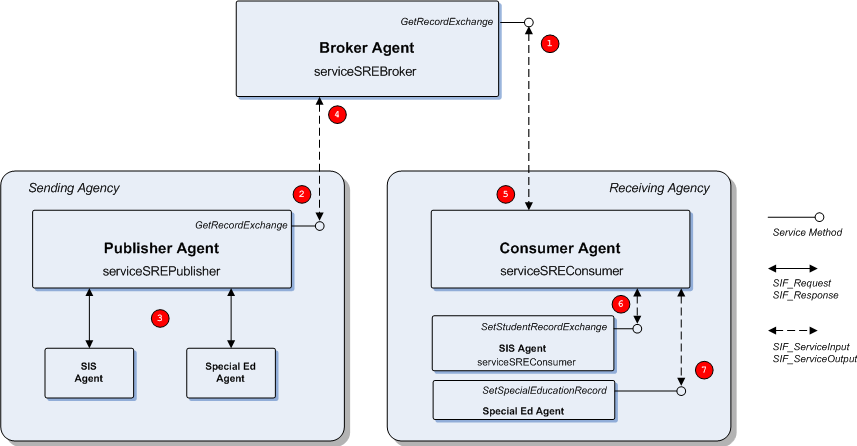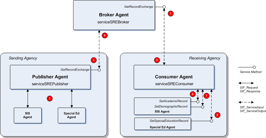 A consumer agent at the receiving agency calls the GetRecordExchange method of the broker agent’s SRE Broker service (step 1). Student records are obtained from a publisher agent at the sending agency via the SRE Publisher service (step 2). The publisher agent issues SIF_Requests to its local zone to construct a StudentRecordExchange object set (step 3) and returns the data back to the requestor (step 4 and 5). The consumer agent then consults the SIF_ZoneStatus object of its local district zone and learns that two applications are capable of consuming student record exchange data. It asks the student information system’s agent, which implements the SRE Student Demographic Record Consumer and SRE Student Academic Record Consumer services, to import those portions of the student data (step 6 and 7). Next, it asks the special education package, which implements the SRE Student Special Education RecordConsumer service, to import the special education record (step 8).
