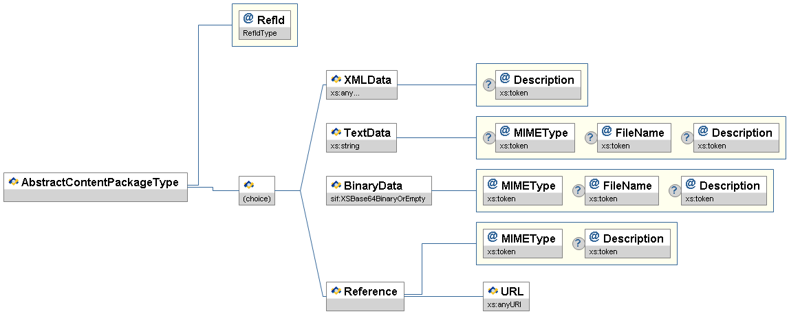 An abstract type for derived content package types, elements and objects. This structure may be used verbatim, optionally extending with additional attributes, or may be redefined to include only a subset of child elements and/or to add validation to XML contained in XMLData. Only one instance of XMLData, TextData, BinaryData or Reference can occur in a single instance.