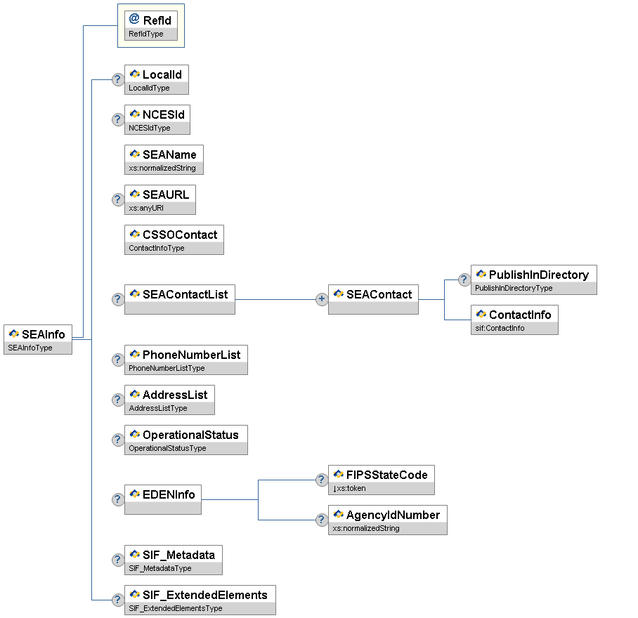 | SEAInfo | This object is designed to facilitate the transfer of State Education Agency (SEA) directory information to the Department of Education (USED) through the Education Data Exchange Network (EDEN). | |||||