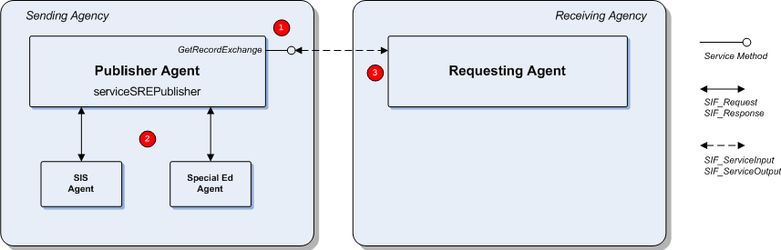 Figure 3 illustrates a requestor calling the GetRecordExchange method of a publisher agent that implements the SRE Publisher service (step 1). The publisher agent issues SIF_Requests to its local zone to construct a StudentRecordExchange object set (step 2) or otherwise obtains the data according to its business rules. The results are returned back to the requesting agent (step 3).