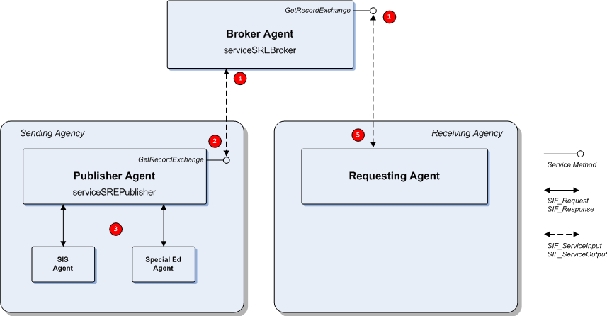 Figure 4 illustrates a requestor calling the GetRecordExchange service method of a broker agent, which implements the SRE Broker service (step 1). The broker then calls the GetRecordExchange service method of a publisher agent that implements the SRE Publisher service to obtain student records (step 2). The publisher agent issues SIF_Requests to its local zone to construct a StudentRecordExchange object set (step 3) or otherwise obtains the data according to its business rules. The results are returned back to the broker agent (step 4), and then back to the requestor (step 5).
