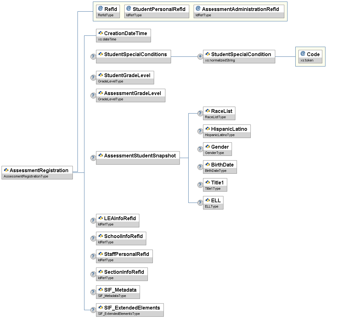 | @ | AssessmentAdministrationRefId | M | The assessment administration associated with the registration. | IdRefType |