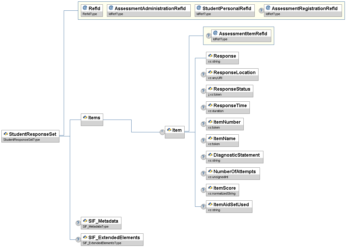 | @ | AssessmentAdministrationRefId | M | The administration associated with the response set. | IdRefType |