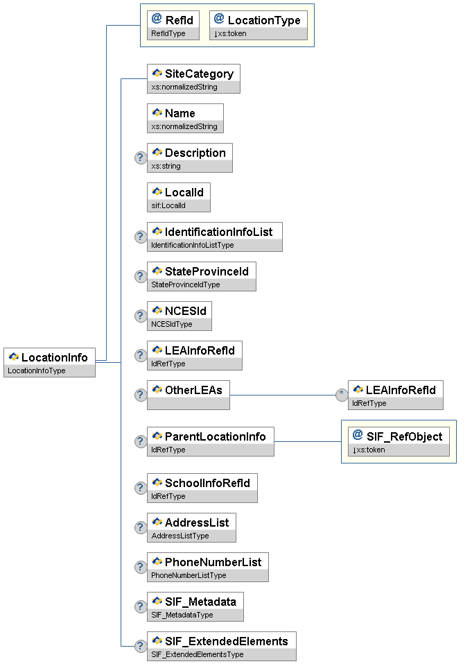 | ParentLocationInfo | O | A LocationInfo instance could be related to another LocationInfo. This element will help create that relation. | IdRefType | |