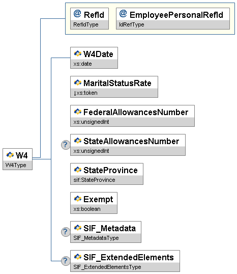 | W4 | This object contains the information completed on a W4 tax form. (Please note that this object is defined to represent the current deductions allowances for the employee; this is not intended to circumvent or replace IRS reporting standards but to faciliatate movement of W4 data from system to system within the LEA.) | |||
