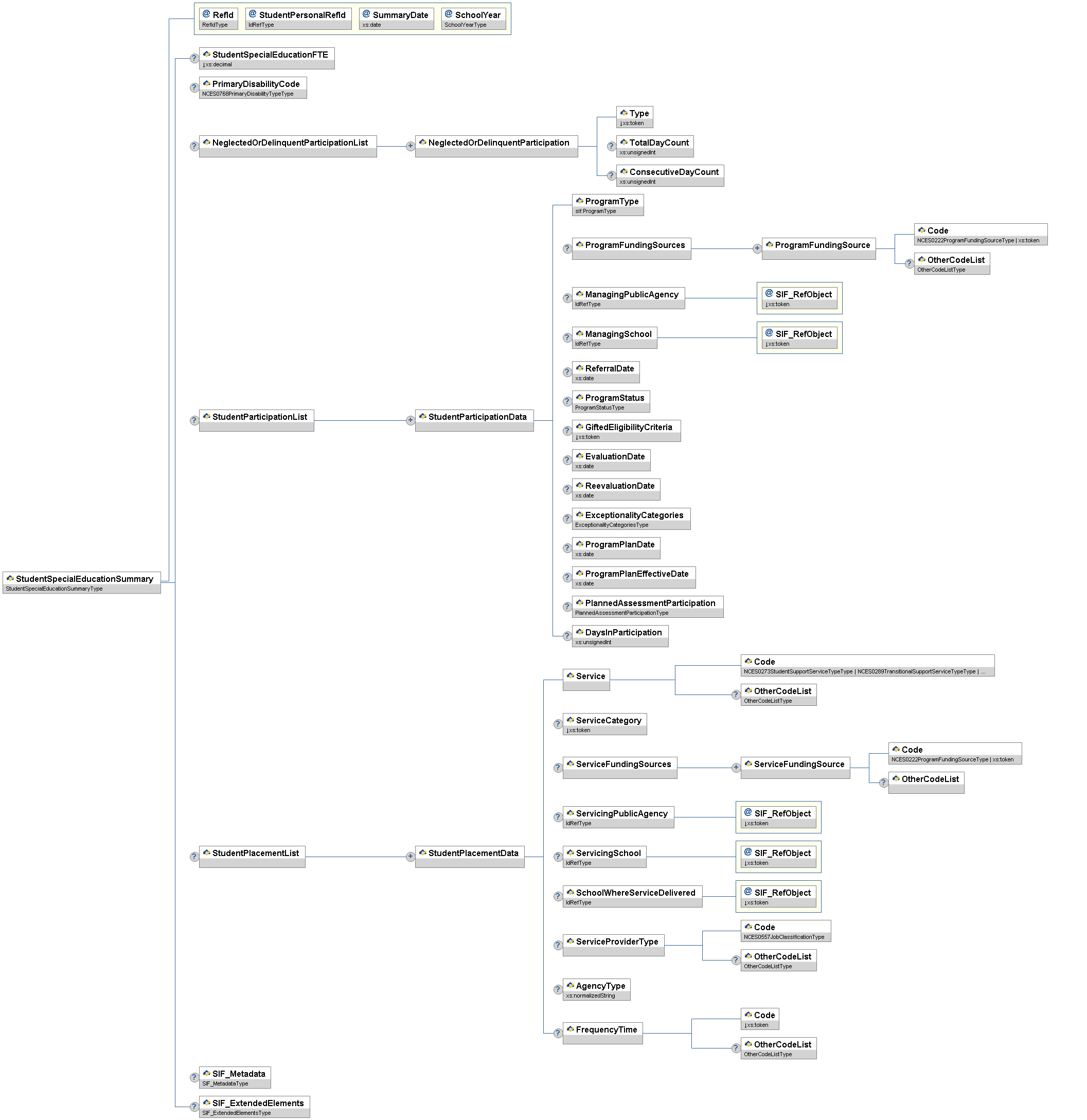 | StudentSpecialEducationSummary | This object provides a summary of a student's participation and placement in special education programs for a given school for a given school year, reflecting the known or calculated values at the time (SummaryDate) the summary was provided. As such, there may be multiple instances of this object for a student in a school over the course of a school year. SIF_Events are not supported by this object. | |||||||||
